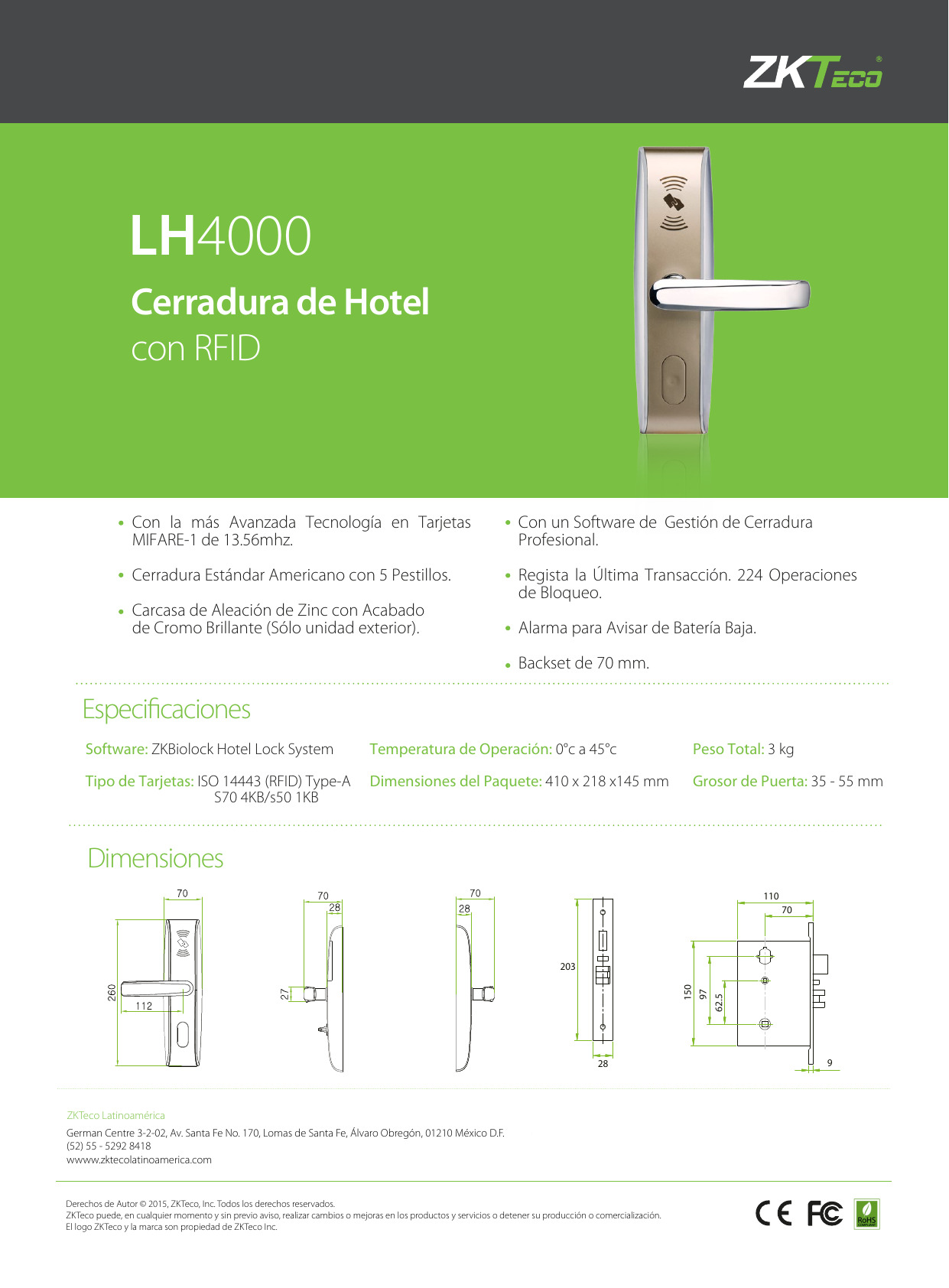 CERRADURA PARA CONTROL DE ACCESO LINEA HOTELERA ZKTECO ZK-LH4000/ZK-LH4000I