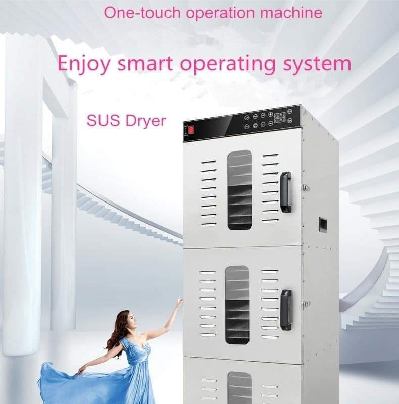 Temperatura de 30 a 100 C, material : Acero inoxidable 304, tiempo de trabajo 24 horas, Potencia 2400 W, bandejas 30, puertas 3, Ruido 35 – 50 db, Peso total 52 kg, peso neto 42 kg, Voltaje 220V VIDEO REFERENCIAL: