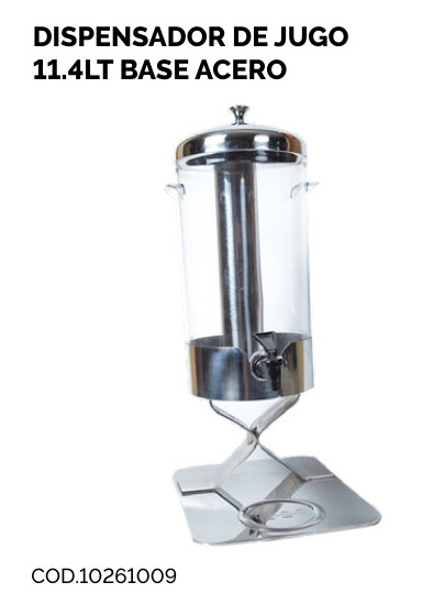 DISPENSADOR DE JUGO, BASE DE ACERO INOXIDABLE CON ENVASE PARA PC, 11.4LTR / 12U.S.QT, 370 X 260 X 530 (H) MM