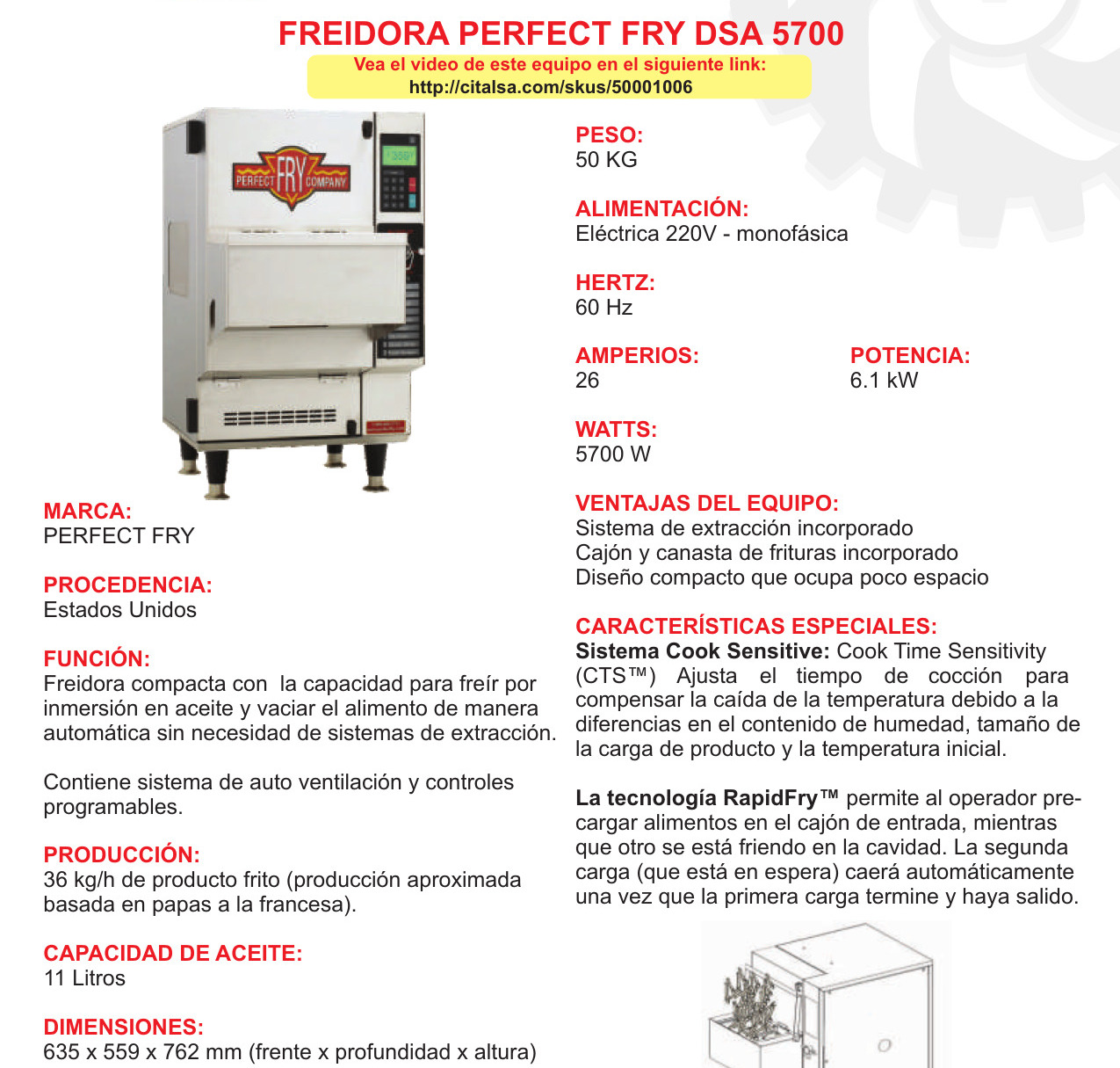 PRODUCCIÓN: 36 kg/h de producto frito (producción aproximada basada en papas a la francesa). CAPACIDAD DE ACEITE: 11 Litros DIMENSIONES: 635 x 559 x 762 mm (frente x profundidad x altura) PESO: 50 KG ALIMENTACIÓN: Eléctrica 200V- monofásica 50 HERTZ: 60 Hz AMPERIOS: 24 A WATTS: 5700 W ESPECIFICACIONES DE INSTALACIÓN: Cable: No.10 Enchufe: 3×50 CONSUMIBLES: Detergente