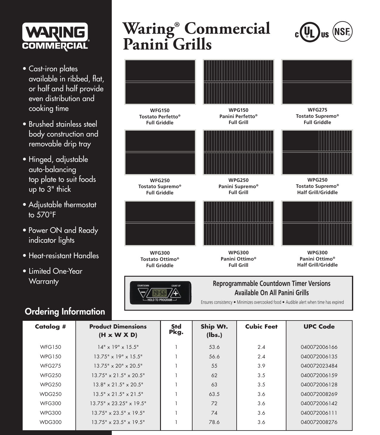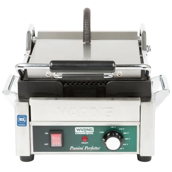 Prepare sándwiches de panini perfectamente asados y más con la parrilla Panini de estilo italiano compacta 120 W Waring® WPG150. Las placas ranuradas de hierro fundido se calientan uniformemente y rápidamente cocinan sándwiches, hamburguesas, pollo y verduras de hasta 3 «de espesor. Su cuerpo de acero inoxidable cepillado y su bandeja de goteo extraíble son fáciles de limpiar. Incluye termostato ajustable a 570 ° F junto con POWER y READY direccionales.
