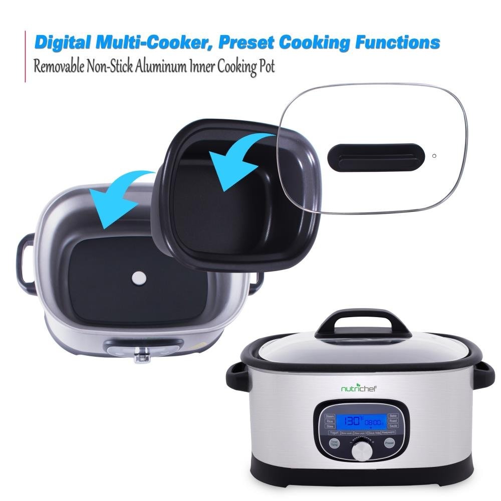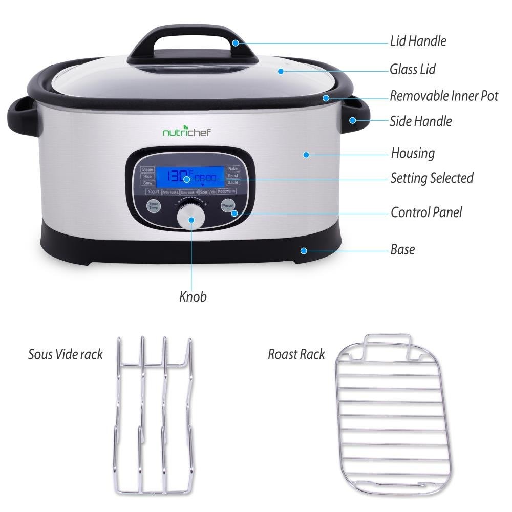 * ajustes de cocción: esta olla olla lenta tiene una temperatura entre 115-395 Fahrenheit y máximo ajuste de tiempo de 72 horas de cocción. El conjunto incluye la cocina multi, asadera, sous vide estante y 3 pies de cable de alimentación