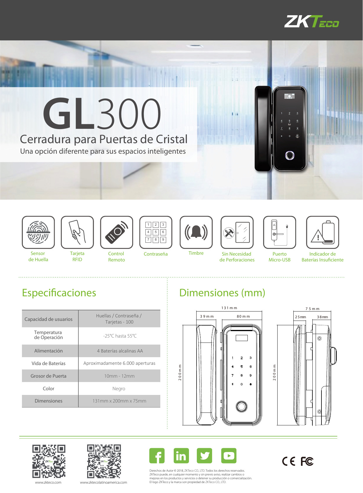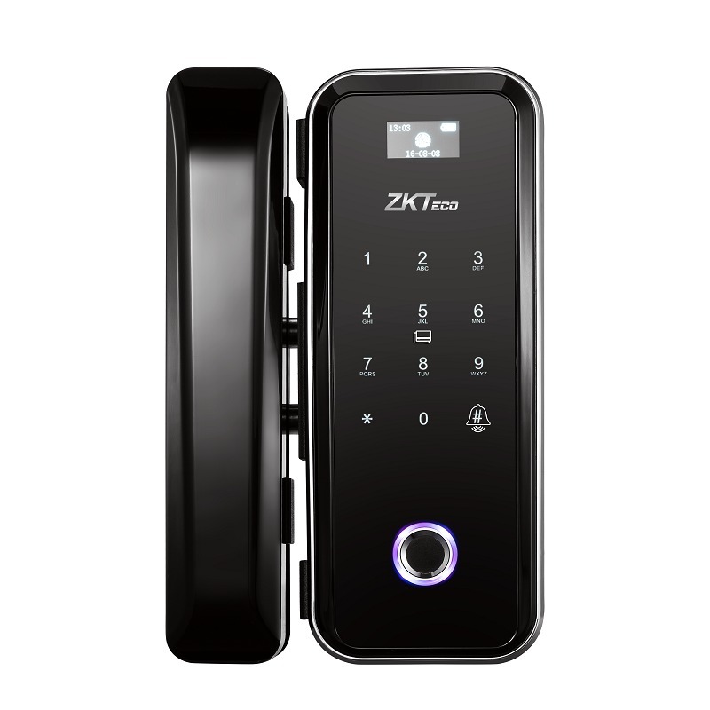Cerradura de puerta de vidrio controlada por huellas dactilares ZKTeco GL300 es una línea de productos dedicada para puertas de vidrio templado que usan huellas digitales, tarjetas, códigos y controles remotos para desbloquear que se lanzaron en los últimos meses de 2018. Esta es la línea de productos de ZKTeco y se investigó durante mucho tiempo y con mucho cuidado antes de lanzar el mercado. Esta es una línea de productos que combina completamente las características de la línea de bloqueo de huellas dactilares para puertas de vidrio, como el diseño moderno, el teclado táctil, la guía de voz, la huella dactilar semiconductora de recepción frontal, el control remoto … .. La puerta de vidrio con control de huellas dactilares ZKTeco GL300 usa baterías, funciona independientemente de la electricidad, es bastante fácil de instalar, por lo que es muy conveniente para casas privadas, tiendas callejeras, oficinas. pequeño
