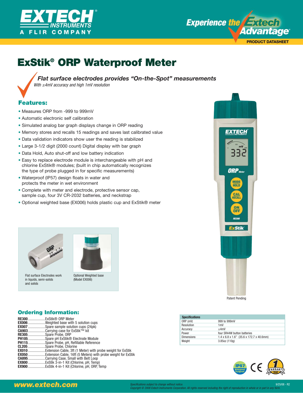 El Extech ExStik RE300 es el primer medidor ORP de mano del mundo utilizado para obtener mediciones del potencial de reducción de la oxidación (ORP) dentro de líquidos, semisólidos y sólidos.