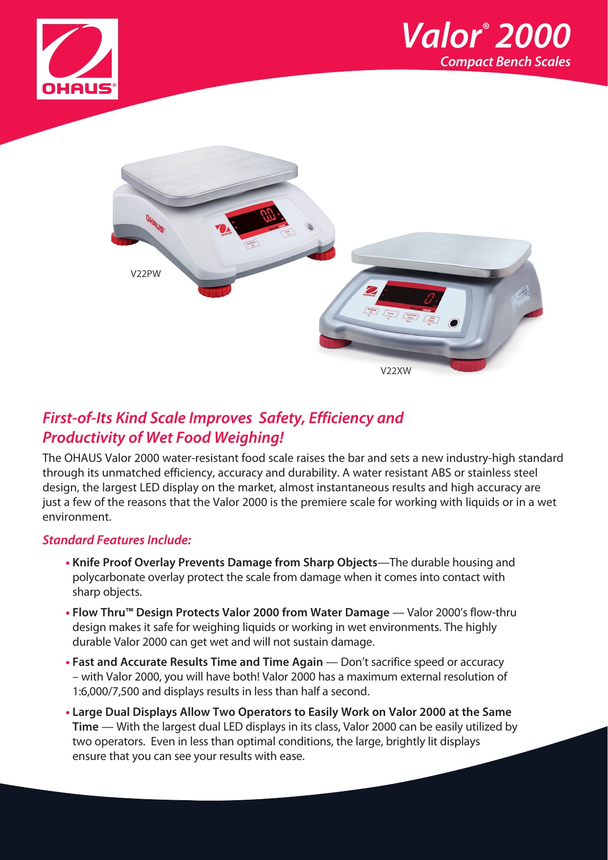 La báscula de alimentos resistente al agua OHAUS Valor 2000 eleva el nivel y establece un nuevo estándar en la industria con la combinación ganadora de velocidad y durabilidad. Disponible tanto en diseños de carcasa de acero inoxidable como de plástico, Valor 2000 ofrece pantallas LED delanteras y traseras grandes, seguridad para alimentos y teclados resistentes a pinchazos, lo que la convierte en la escala de valor principal para uso en entornos secos o de lavado.