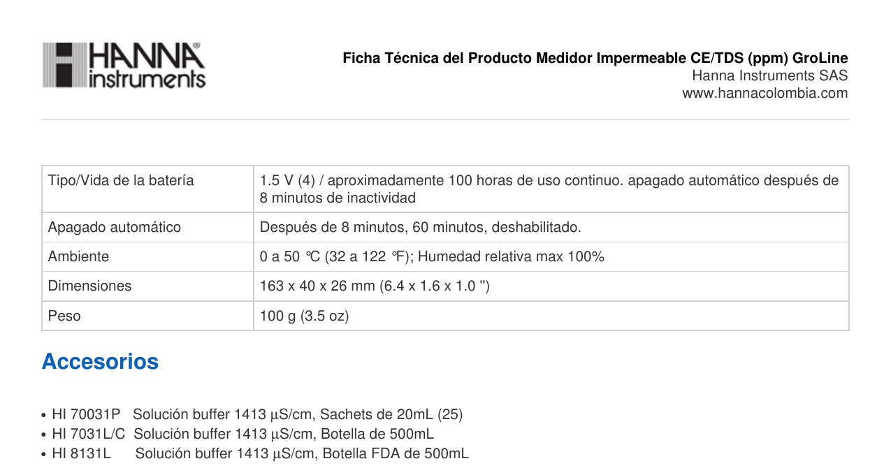 Información sobre pedidos El medidor HI98318 GroLine EC / TDS se suministra con una tapa protectora, (4) sobres de calibración de calibración rápida HI50036 (20 ml), (1) batería CR2032, manual de instrucciones y certificado de calidad.