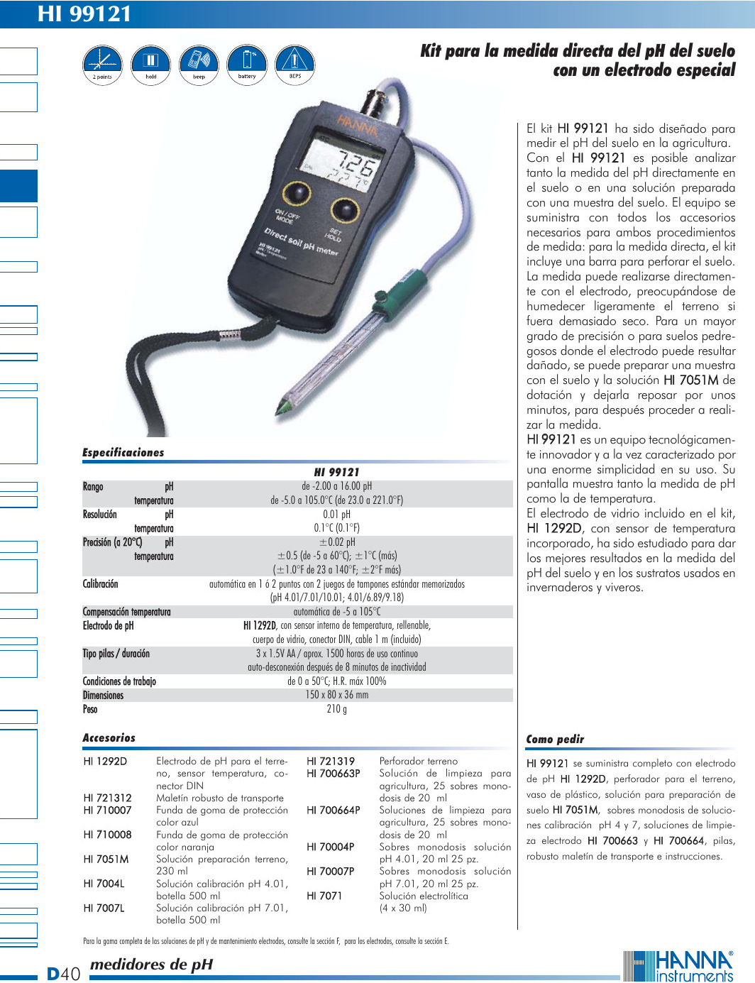HI99121 se suministra con la sonda de pH / temperatura HI12923 con cuerpo de vidrio y el conector DIN de conexión rápida con cable de 1 m (3.3 ‘), pH 4.01 y 7.01 sobres de tampón, electrodo de solución de limpieza de electrodo HI700663 para depósitos de suciedad, producto de solución de limpieza de electrodos HI700664 para depósitos de humus HI7051M solución de preparación de suelo, barrena de tierra HI721319, vaso de precipitados de 100 ml, baterías AAA de 1.5V (3), certificado de calibración del medidor, certificado de sonda de la sonda, manual de instrucciones y maletín de transporte resistente HI710142.
