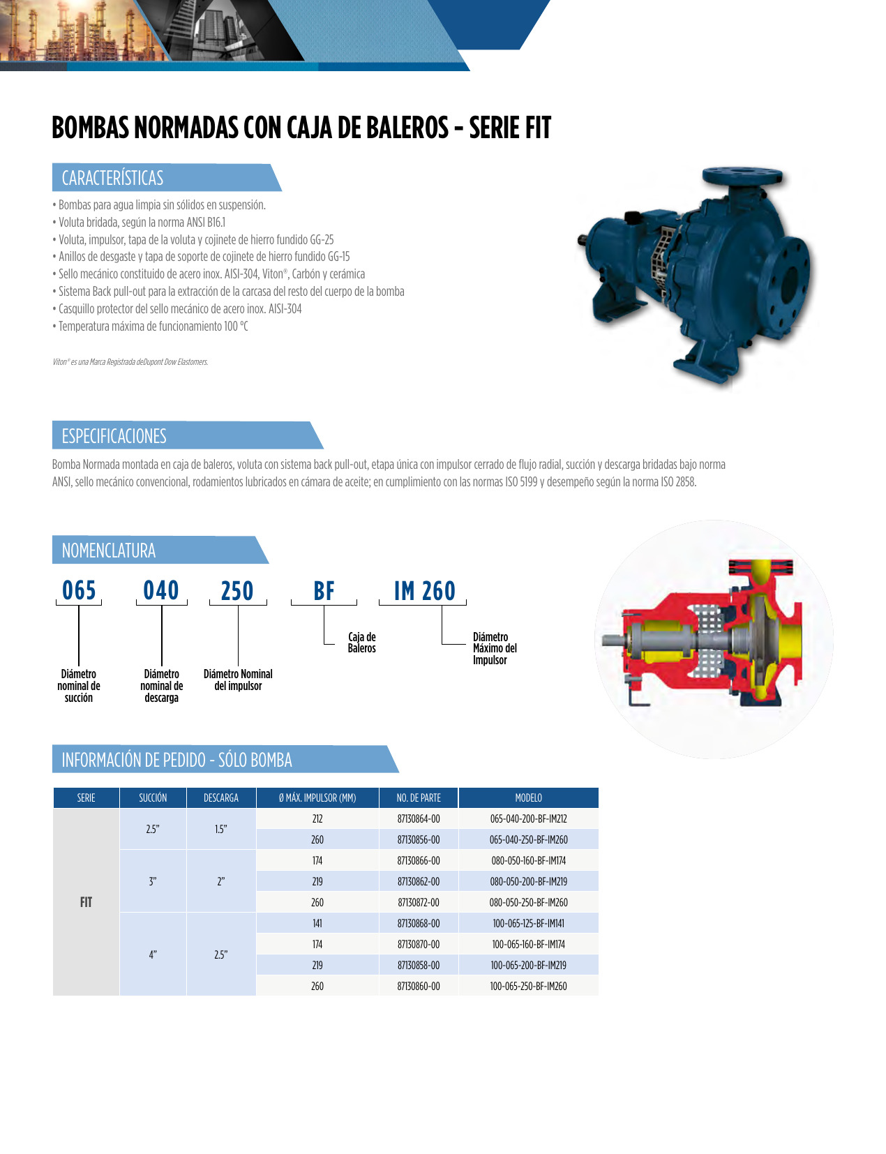 La Serie FIT con Caja de Baleros y carcasa espiral, ha sido diseñada para satisfacer la demanda del mercado en aplicaciones tales como el riego, sistemas de refrigeración, suministros de construcción, industrial, sistema de prevención y extinción de incendios, entre otros.