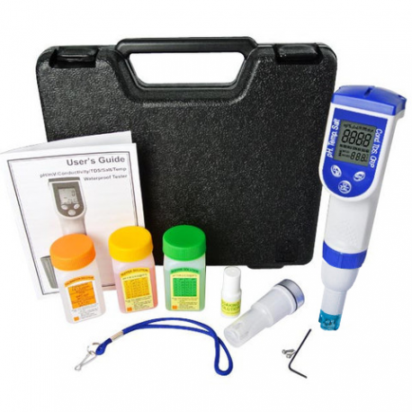 MULTIPARAMETRO resistente al agua, sirve para medir el pH, la conductividad, sólidos totales disueltos, la salinidad y a temperatura. Al conectar el pH-metro se llevará a cabo una auto revisión para poder asegurar la precisión en la medición. El pH-metro está equipado con un indicador de estabilidad. Los factores EC / TDS y de compensación de temperatura pueden ser adaptados a las condiciones ambientales. En la calibración del valor del pH se podrán elegir diferentes limitaciones estándar. El pH-metro Combo posee un soporte de electrodos en el que se encuentra el electrodo para el pH y un electrodo para la conductibilidad y la salinidad que se pueden intercambiar fácilmente.
