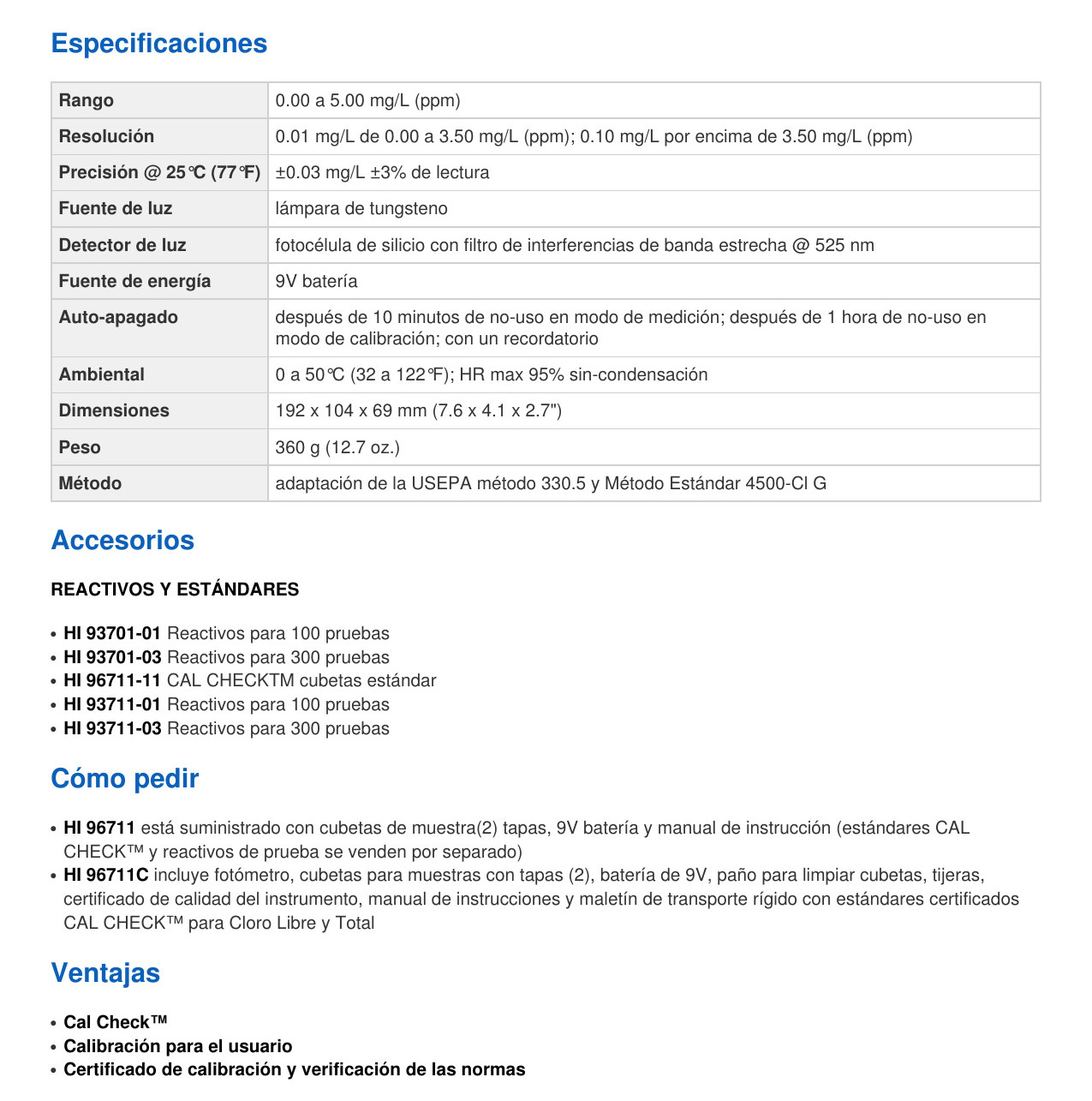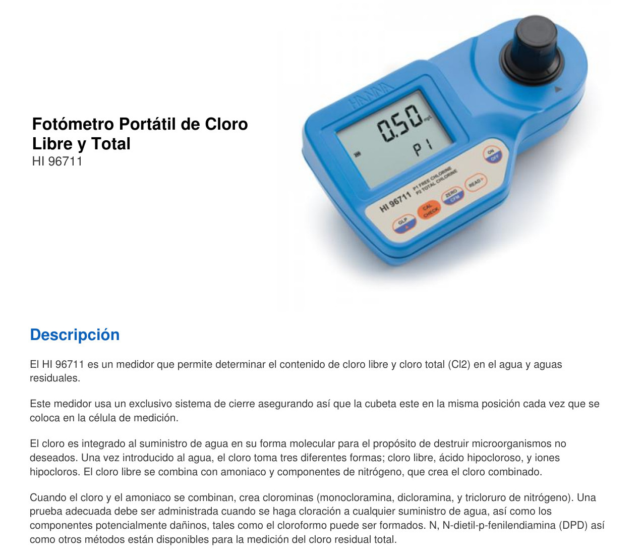 El HI 96711 es un medidor que mide el contenido de cloro libre y cloro total (Cl2) en el agua y aguas residuales.