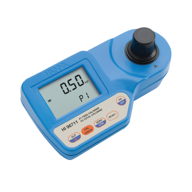 El HI 96711 es un medidor que permite determinar el contenido de cloro libre y cloro total (Cl2) en el agua y aguas residuales. Este medidor usa un exclusivo sistema de cierre asegurando así que la cubeta este en la misma posición cada vez que se coloca en la célula de medición. El cloro es integrado al suministro de agua en su forma molecular para el propósito de destruir microorganismos no