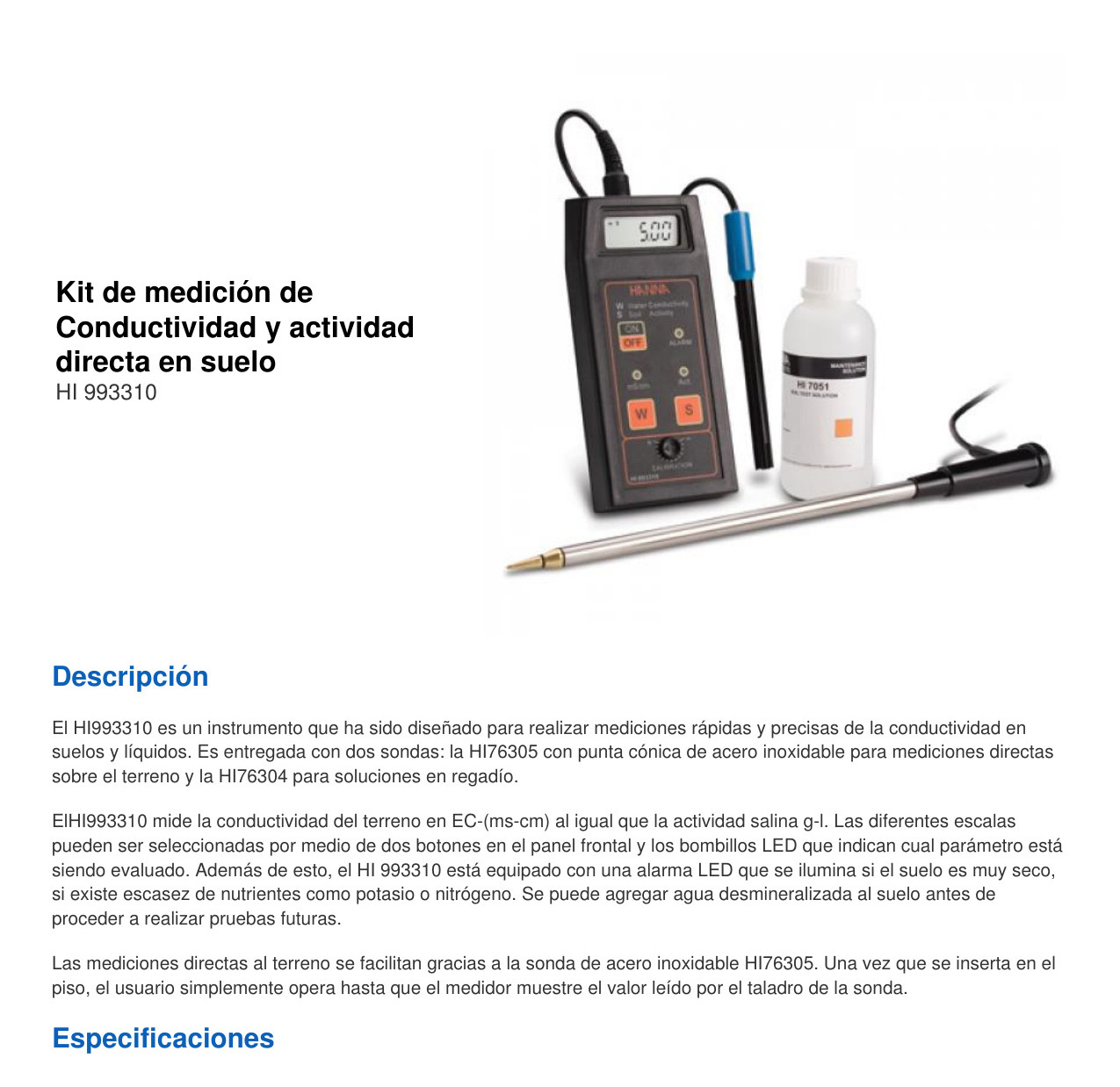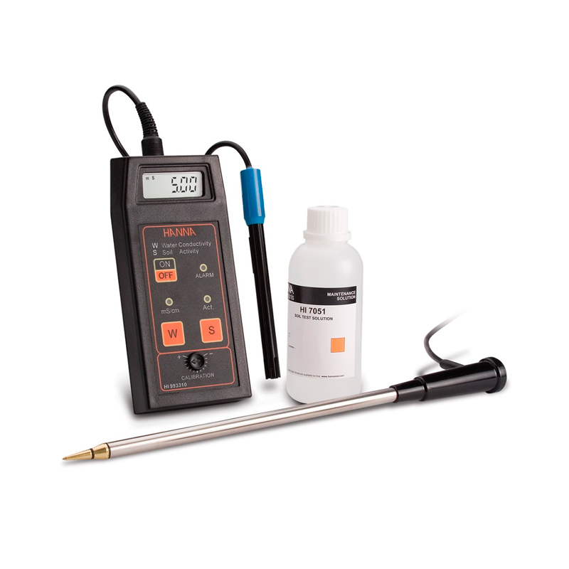 El conductímetro portátil, HI993310 es un medidor robusto que ha sido diseñado para realizar mediciones de conductividad y actividad rápidas y precisas en líquidos y suelos. El medidor HI993310 mide directamente la actividad del suelo (g/L) y la conductividad CE (mS/cm) en soluciones líquidas tales como aguas de irrigación, soluciones nutritivas. El conductímetro portátil HI993310, se suministra completo con sondas HI76304 y HI76305 (para medición directa del suelo), perforador suelo HI721319, pilas, instrucciones y maletín de transporte.