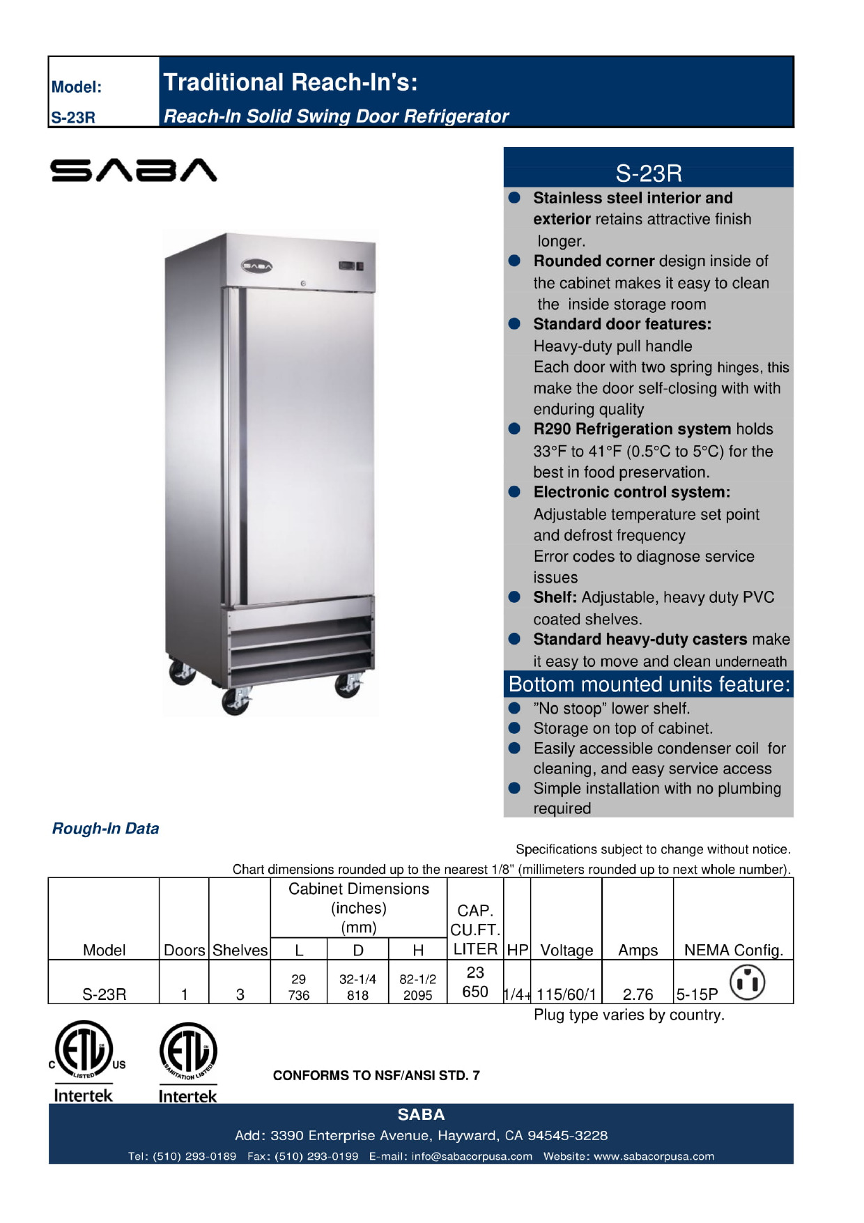 Las puertas sólidas Saba proporcionan al mercado una línea de productos diseñados para brindar años de servicio sin problemas en aplicaciones comerciales exigentes. Saba es reconocido por tener la mejor garantía respaldada por una red de técnicos de servicio autorizados. La puerta sólida permite una visión sin esfuerzo de los productos sin abrir puertas. Estas puertas sólidas tienen un interior y exterior de acero inoxidable y requieren una conexión eléctrica de 120V. Este ST-23R es perfecto para la industria del servicio de alimentos, ya que le brinda a su establecimiento un área para mantener frescas las bebidas y los alimentos.