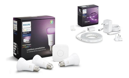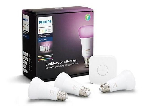 Philips Hue Kit Inicio Color Añade color ambiental a cualquier habitación con el kit de inicio Philips Hue White and Color Ambiance. El kit incluye 3 focos inteligentes de color y un Hue Bridge, que proporciona control total de las luces, acceso a la aplicación Hue y un sinfín de funciones.